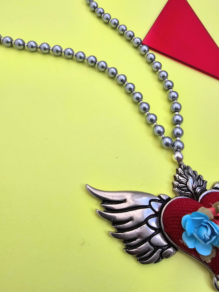 Introducing our exquisite Alas De Amor, a true embodiment of elegant artistry. This stunning piece features delicate silver beads meticulously crafted into a captivating design. At the center of attention is a heart-accented charm with graceful wings, symbolizing the boundless power of love and freedom. Surrounding the charm are soft fabric roses in a gentle hue, exuding a touch of romance and femininity. The roses are further enhanced by a vibrant red bead, adding a pop of color and allure.